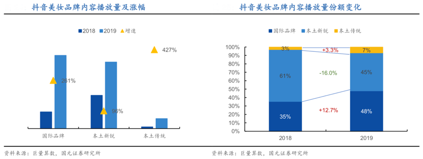 經典案例:根據巨量算數、國元證券研究所等綜合資訊表明,2019 年,抖音美妝品牌年度關注量較 2018 年增長了 166%,其中國際品 牌與本土傳統品牌增長更明顯,內容播放量同比增速分別達到 261%與 427%,份額分別提升 12.7%與 3.3%,本土新銳品牌經歷了 2018 年爆發增長后基數較大,2019 年增速開始回歸,但也實現了+96%的快速增長。