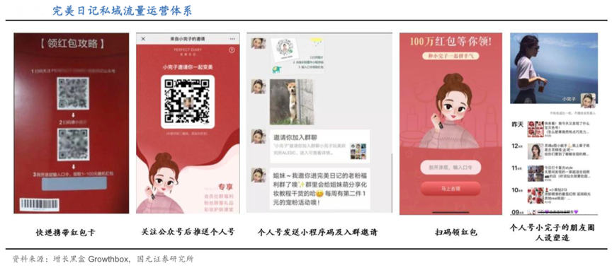 經典案例:根據增長黑盒Growthbox、國元證券研究所等綜合資訊表明,完美日記通過產品附帶的二維碼作為流量入口,消費者在完美日記首次完成購買后會收到附帶的紅包卡,引導客戶關注完美日記公眾號和個人客服“小完子”,品牌方僅需花費 1-2 元紅包即可獲得一個公眾號粉絲、一個個人號好友、一個群成員。完美日記的個人號“小完子”是有獨立人設的美妝顧問,她的朋友圈會發 美妝教程、素顏自拍、產品圖片,同時為客戶解答疑問,分享優惠。