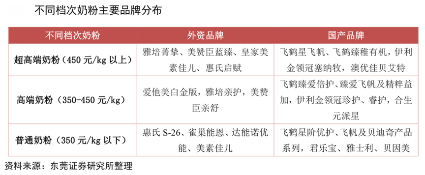經典案例:根據東莞證券研究所等綜合資訊表明,超高端奶粉(450 元/kg 以上)主要以外資品牌為主:雅培菁摯、美贊臣藍臻、皇家美 素佳兒、惠氏啟賦。國產品牌:飛鶴星飛帆、飛鶴臻稚有機,澳優佳貝艾特,伊利金領冠塞納牧。國產品牌在超高端上的突破主要在于:有機奶粉、羊奶粉及產品差異化。