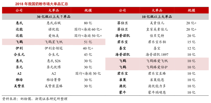 經典案例:根據奶粉圈、浙商證券研究所等綜合資訊表明,飛鶴投入大量資源打造星飛帆,2018 年收入規模已達到 50 億級別,19年達到 70 億級 別,僅次于惠氏啟賦、達能諾優能和愛他美,為國產奶粉第一大單品,其旗下臻愛飛帆、 臻愛倍護兩個大單品也已達到超 10 億級別。