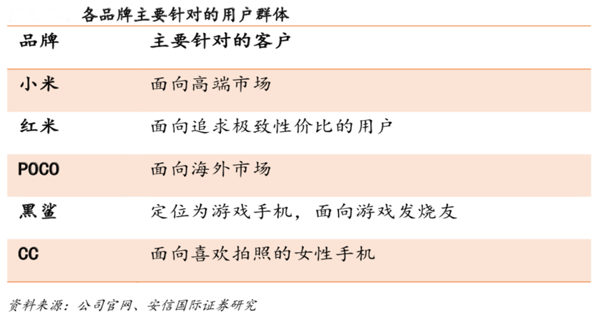 經(jīng)典案例:根據(jù)公司官網(wǎng)、安信國際證券研究等綜合資訊表明,小米采用了品牌的分拆戰(zhàn)略,將自身的手機業(yè)務(wù)細分為了5個不同的子品牌:面向中高端的小米、鎖定中低端的紅米、出海的 POCOPHONE、玩游戲的黑鯊、以及女性拍照專屬的 CC,多產(chǎn)品&多品牌組合優(yōu)勢突出。
