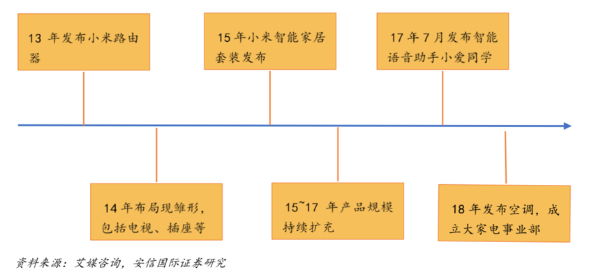 經(jīng)典案例:根據(jù)艾媒咨詢、安信國際證券研究等綜合資訊表明,小米的智能家居生態(tài)鏈布局,可以追溯到 2013 年,在 2013 年 11 月小米發(fā)布了小米路由器。打算以路由器為中心,將智能家居硬件聯(lián)網(wǎng)并以手機 APP 為入口控制所有硬件。隨后,小米變便開始了整體的布局,并且日益繁盛。