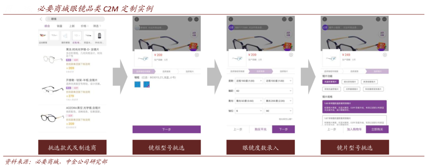 經典案例:根據必要商城、中金公司研究部等綜合資訊表明,客戶在必要商城選擇好鏡片、鏡框并錄入眼鏡度數后,制造商會 接受訂單進行生產并直接發貨,一般的生產周期為 3 天,完全繞過了中間環節且基本上消除了成品庫存問題。必要認為眼鏡這一商品的本質不是高端的光學設備,而應該是日常可選的配飾,并且通過 C2M 對生產價值的鏈的改造,實現了眼鏡的平價化、高性價比化,