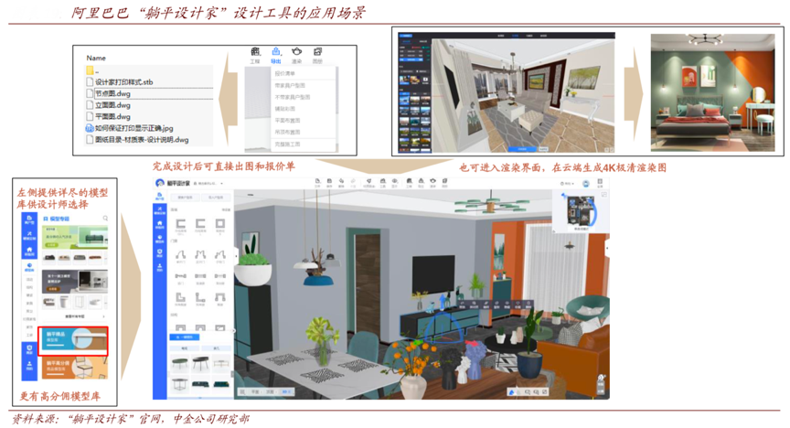 經典案例:根據“躺平設計家”官網、中金公司研究部等綜合資訊表明,2019 年 9 月,阿里巴巴 5 億元戰略投資三維家,由三維家賦能“躺平”平臺。阿里巴巴“躺平”平臺的目標是為品牌提供更加優秀的制造能力和營銷能力、讓品牌的設計成為由設計師和消費者驅動的 C2M 式設計。于設計師,“躺平”希望為設計師提供優秀的設計工具、免費的渲染服務、成熟的分傭體系和完整的供應鏈。設計師將能夠在“躺平”的設計后臺 看到制造商的工藝能力,保證設計可以直接成為產品,“所見即所得”。