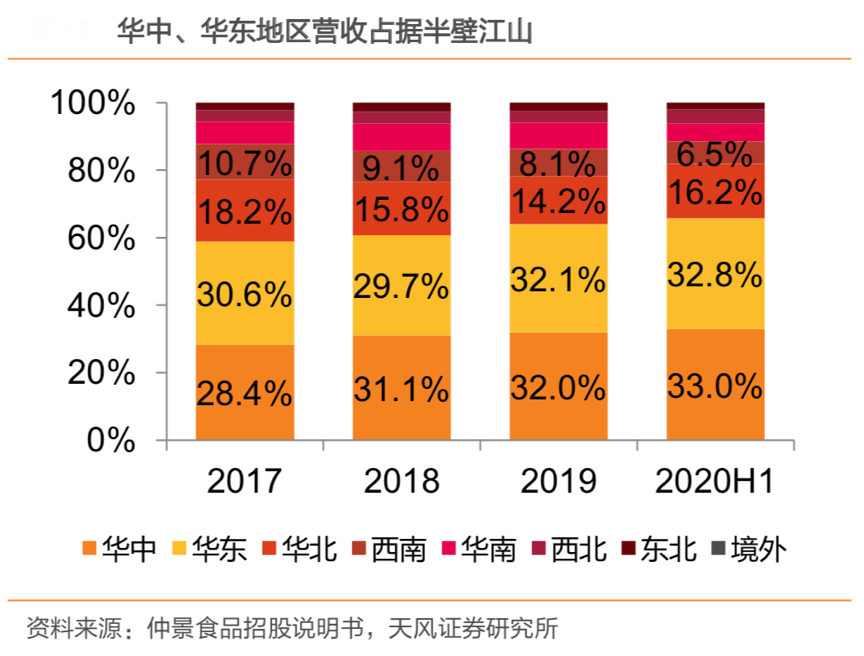 經典案例:根據仲景食品招股說明書、天風證券研究所等綜合資訊表明,仲景食品深入挖掘華中地區、華東地區食品制造業較為發達的區位優勢,推動花椒系列、辣椒系列等調味配料進入各食品制造企業的采購目錄;同時,不斷創新牛肉醬等新品類,河南省和山東省調味食品銷售收入占 公司調味食品銷售收入的比例接近60%,2020H1 占比達 58.80%。