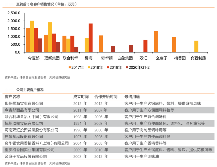 經典案例:根據仲景食品招股說明書、天風證券研究所等綜合資訊表明,仲景食品調味配料通過直銷的模式銷售收入占比約 90%。直銷客戶主要為調味料、方便食品、肉制品、休閑食品的大中型食品生產企業。同時其已經與下游客戶食品制造企業建立了持續穩定的合作關系,今麥郎、頂新集團、聯合利華等較為穩定,前 5 大 客戶收入占總收入比重20%左右。
