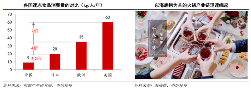 典型現(xiàn)象:根據(jù)前瞻產(chǎn)業(yè)研究院、海底撈、中信建投等綜合資訊表明,隨著居民外出就餐減少,為追求食品的便捷性,家庭消費(fèi)速凍食品比例提升,自熱火鍋、半成品菜等新興食品出現(xiàn),同時(shí),渠道用速凍食品、火鍋 底料需求快速爆發(fā)。目前中國餐飲連鎖占整體比重 5-10%,發(fā)達(dá)國家美國、日本超過 50%,國內(nèi)餐飲連鎖化趨 勢明顯。川菜、湘菜對食材要求不高,標(biāo)準(zhǔn)化、連鎖化優(yōu)勢明顯,尤其是火鍋產(chǎn)業(yè)鏈近年來發(fā)展迅猛。