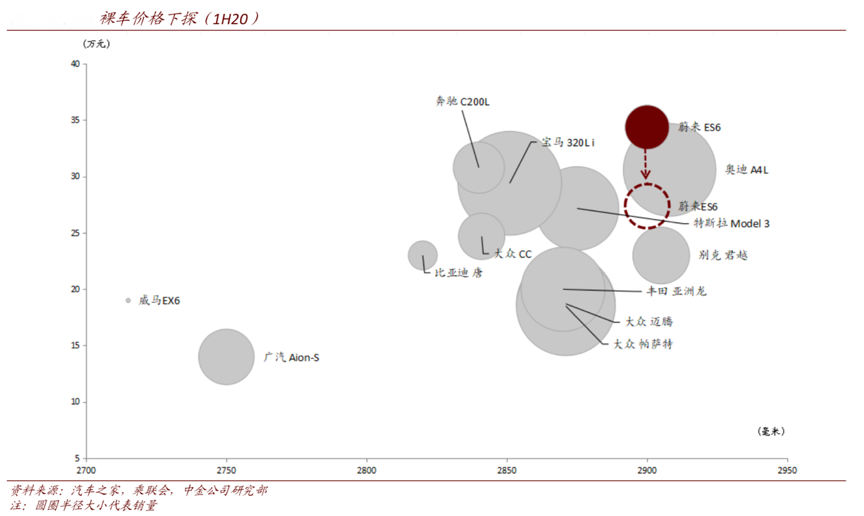經典案例:根據汽車之家、乘聯會、中金公司研究部等綜合資訊表明,蔚來汽車已于 2020 年 8 月推出Baas(Battery as a Service)服務,即消費者可以只購買裸車(無電池),后期每月支付一定費用以租賃電池,這使得購買價格直接下降,有利于采購平價。Baas 方案可使得 ES6 補貼后裸車價格直接下探至 27.4 萬元,大大提升了產品的市場競爭力。
