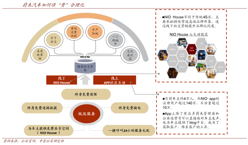經典案例:根據公司官網、中金公司研究部等綜合資訊表明,蔚來汽車并沒有直接降價來解決貴的問題,而是通過提供極致服務、圈層營銷,使“貴”合理化。一方面,蔚來提供全面、極致的售后服 務體驗,包括終身免費道路救援、終身免費質保、終身免費道路換電、免費共享空間等; 另一方面,線下 NIO House 和線上 APP 社區齊發力,利用圈層社交營銷,提升品牌認可度,塑造高端形象,使“貴”合理化。