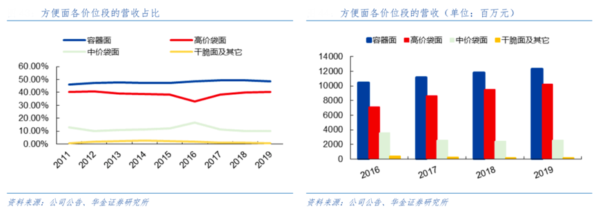 經(jīng)典案例:根據(jù)公司公告、華金證券研究所等綜合資訊表明,截至2019年康師傅方便面銷(xiāo)售量市占率 43.3%,維持第一的市占率水平。從銷(xiāo)售額方面,公司的方便面銷(xiāo)售達(dá)到 253 億元,在方便面市場(chǎng)的規(guī)模遙遙領(lǐng)先。其中,高端方便面的營(yíng)收是逐年上升的,其中 2019 年容器面和高價(jià)袋面分別實(shí)現(xiàn)營(yíng)收 123 億元和 102 億元,收入占比提升到 89%;中價(jià)及中低價(jià)方便面的收入占比下降到 11%左右。