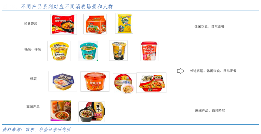 經(jīng)典案例:根據(jù)京東、華金證券研究所等綜合資訊表明,各方便面龍頭廠商通過(guò)不斷豐富產(chǎn)品食用方式(泡式、干拌式→煮式和自 熱式)、多樣化產(chǎn)品包裝(袋裝、杯裝、碗裝等)、多樣化的口味(以康師傅為例,方便面有 260 多種不同的口味),橫縱擴(kuò)寬了消費(fèi)場(chǎng)景,從主餐替代、休閑零食到主餐化的發(fā)展,從藍(lán)領(lǐng)到白 領(lǐng),從低收入人群到中高收入人群,從過(guò)去的工地、長(zhǎng)途路途的充饑場(chǎng)景,到現(xiàn)在辦公室加班、外出游玩、Party 聚會(huì)、游樂(lè)園等,隨身攜帶隨時(shí)食用。