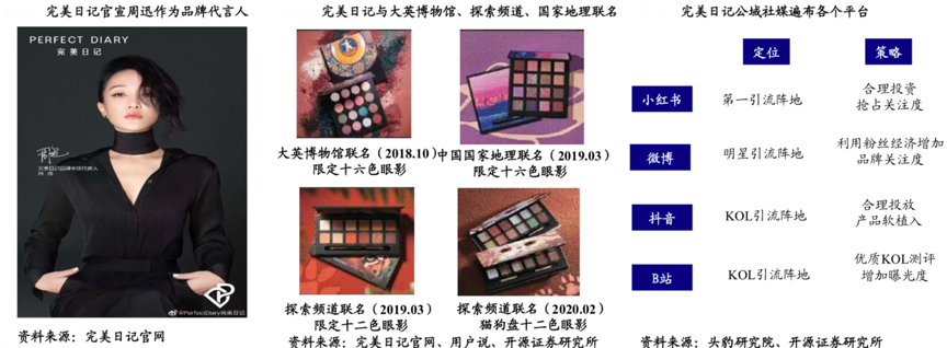 經典案例:根據完美日記網官網、用戶說、頭豹研究院及開源證券研究所等綜合資訊表明,完美日記的用戶經營極具看點,其于2020年10月官宣周迅作為品牌全球代言人,聯合李佳琦進行傳播,并先后與大英博物館、Discovery探索頻道、中國國家地理、紐約大都會藝術博物館聯名,社媒渠道遍布小紅書、微博、抖音、B站等各個平臺,粉絲量行業領先。截至2020年11月,完美日記的小紅書品牌賬號已擁有194.9萬粉絲,遠超其他知名國貨、外資彩妝品牌。