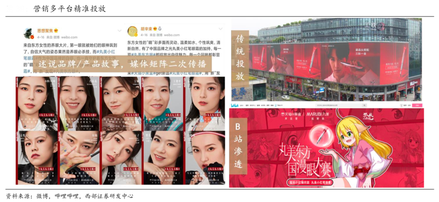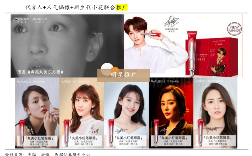 經典案例:根據天貓、微博、西部證券研發中心等綜合資訊表明,丸美由代言人周迅發起#點亮丸美東方眼#話題,并邀請人氣偶像朱正廷擔任品牌大使,同時聯合吳倩、李藝彤、孫怡、李純、 陳鈺琪五位新生代小花炒熱話題,共同推廣新品“小紅筆”。 同時聯手各類美妝博主、時尚達人等 KOL 和 KOC,通過抖音、B 站、微博、小紅書等多個社媒平臺發布好物分享、產品測評、種草筆記等營銷內容,帶出“小紅筆”的用法、成分和功效,助力產品出圈。