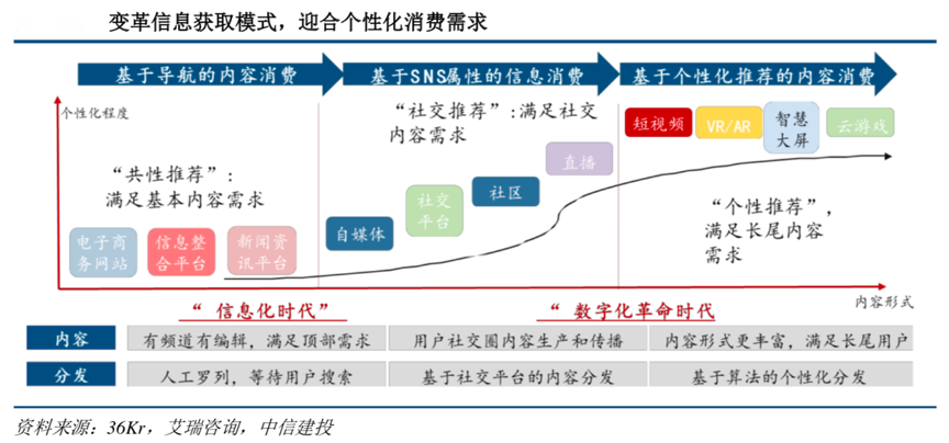 經典表現:根據36Kr、艾瑞咨詢、中信建投等綜合資訊表明,2012年起,以今日頭條、一點資訊為代表的算法主導型資訊應用迅速崛起并成為新聞資訊行業的重要玩家;此后智能推薦算法技術應用于其他泛娛樂內容的分發模式上,并在短視頻領域誕生了抖音和快手兩家新巨頭。