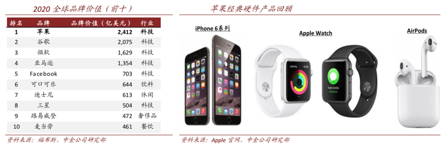 經典案例:根據福布斯、中金公司研究部等綜合資訊表明, 2020 年蘋果品牌價值 2,412 億美元,超過谷歌、微軟、亞馬遜、Facebook 等科技龍頭公司,位居全球首位。2007-2019 年間,蘋果陸續推出 iPhone,iPad,Apple Watch,AirPods 等多款經典的創新硬件,不僅打造了以 iPhone 為核心的智能硬件生態,同時持續產品品類,打開了市場對可穿戴設備的想象空間。