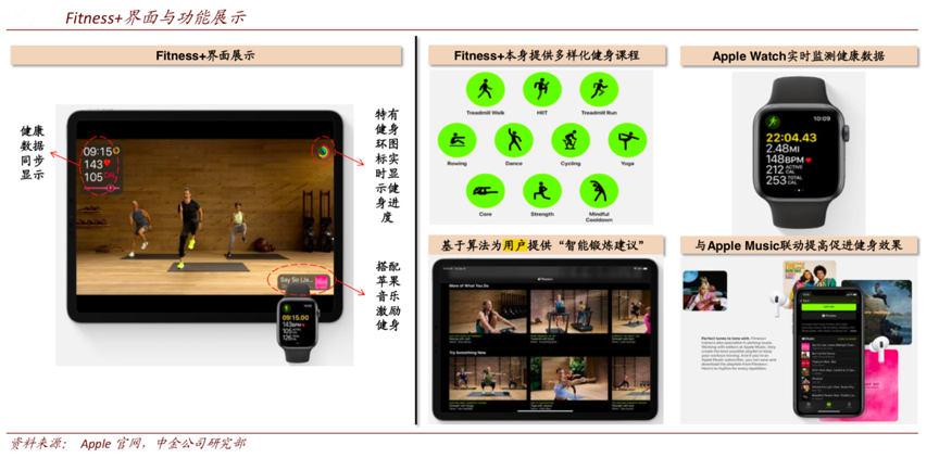 經典案例:根據Apple官網、中金公司研究部等綜合資訊表明,Fitness+是蘋果推出的一款軟件服務功能,以Apple Watch 為接入口與用戶實現交互,用戶僅需 9.99 美元/月便可訂閱服務。主要包含以下四項主要功能:健身課程提供:Fitness+應用本身提供多樣化的主流應用課程,包括 HIIT(高強度間歇訓練)、瑜伽、動感單車等十余種課程選擇,滿足用戶的多樣化需求。