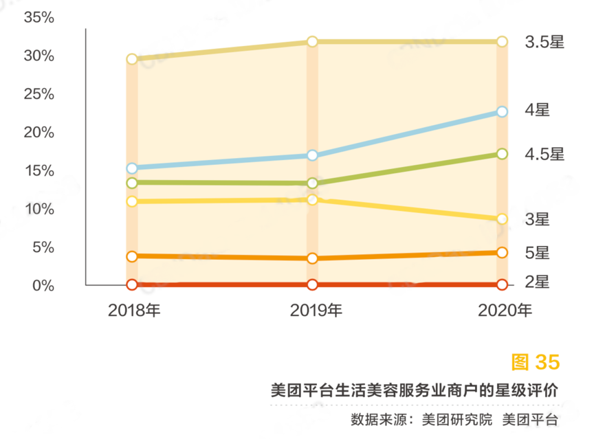 經(jīng)典案例:根據(jù)美團(tuán)平臺(tái)、美團(tuán)研究院等綜合資訊表明,生活美容服務(wù)業(yè)商戶中 4 星、4.5 星、5 星的高星級(jí)商戶占比逐漸上 升,3 星及以下商戶的占比逐漸下降(見(jiàn)圖 35)。分品類(lèi)來(lái)看,用戶評(píng)價(jià)在 4 星及以上的高 分評(píng)價(jià)商戶中,紋身商戶占比最高,高分評(píng)價(jià)占比達(dá)到 68%。