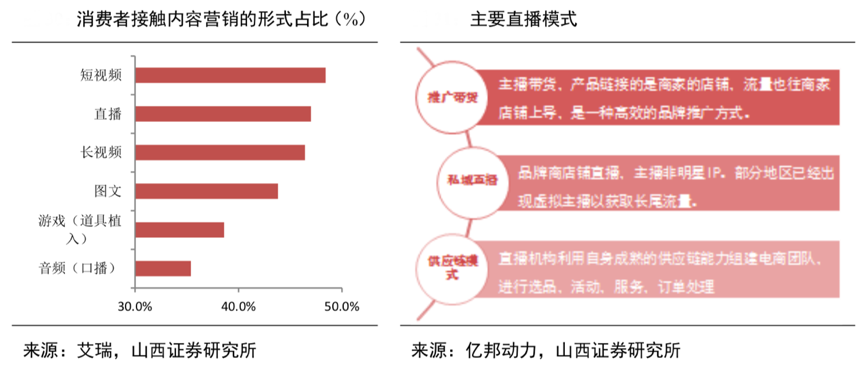 經典案例:根據艾瑞、億邦動力、山西證券研究所等綜合資訊表明,相較于廣告的單一宣傳作用,直播電商具有非計劃性、強互動和碎片化特征,“高獲客量及高購買轉化率”使其成為目前變現效率最高的營銷方式。目前直播方式愈發成 熟,由傳統的推廣帶貨、私域直播向供應鏈模式發展,要求主播從選品、活動、服務到訂單處理等各個環節的銜接有較高要求。