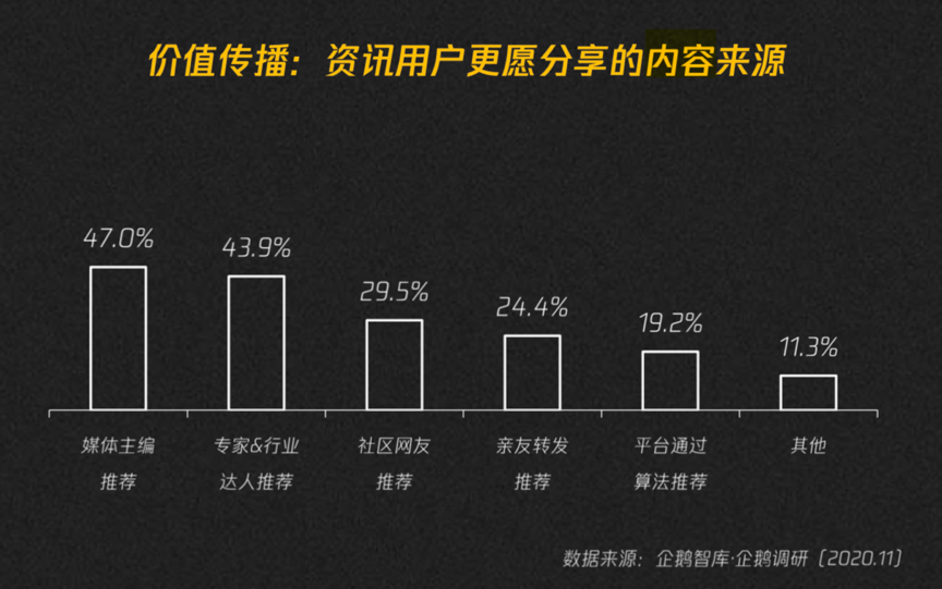 經典案例:根據企鵝智庫等綜合資訊表明,價值傳播方面,資訊用戶更愿意分享的內容來源在于,專業媒體人、行業專家達人、活躍的社區用戶,都將成為內容分發體系中的多元管道,為用戶帶來豐富的內容多樣性和眼界拓展。媒體主編推薦占47%,專家&行業達人推薦達43.9%。