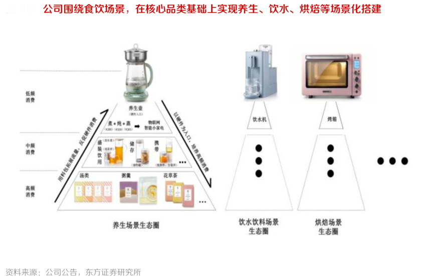 經(jīng)典案例:根據(jù)公司公告、東方證券研究所等綜合資訊表明,北鼎股份公司主打核心品類基礎(chǔ)上的場景化搭建,即基于養(yǎng)生壺等廚房小家電品類,縱向拓展至周邊用品及周邊食材,通過低頻消費(廚房小電)+中頻消費(周邊用品)+高頻消費(周邊食材)的產(chǎn)品組合打造養(yǎng)生場景; 橫向角度積極開發(fā)飲水機(jī)、烤箱等品類產(chǎn)品線,構(gòu)造對應(yīng)的桌面健康飲水飲料、烘焙等場景。