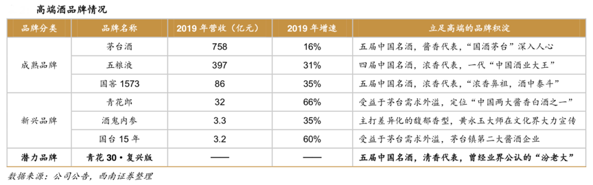 經典案例:根據(jù)公司公告、各品牌官網、西南證券等綜合資訊表明,茅臺、五糧液、瀘州老窖均多次蟬聯(lián)中國名酒,曾多年問鼎過行業(yè)一哥,同時受益于醬香熱疊加茅臺供給不足,醬酒中品牌力較為優(yōu)秀的青花郎和國臺 15 年借機向高端發(fā)力;此外酒鬼內參具有馥郁香型的差異化產品特點,早年黃永玉大師在文化圈的宣傳奠定了較高的品牌格調,這三個新銳品牌近幾年均增長勢頭迅猛。