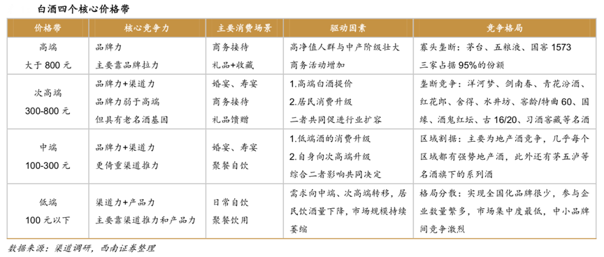 經典案例:根據(jù)渠道調研、各品牌官網、西南證券等綜合資訊表明,居民收入水平高低各異疊加不同場景中消費屬性差異較大,白酒得以形成上至超 3000 元,下至 10 多元的寬闊價格帶。目前,白酒行業(yè)可劃分為高端、次高端、中端、低端四個核心價格帶,各價格帶的核心競爭力和驅動因素差異明顯,均有自身內在的發(fā)展邏輯和細分。