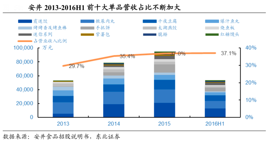 同時根據安井食品招股說明書、東北證券等綜合資訊表明,安井順應家庭端火鍋料 消費的高端化所推出的單品“鎖鮮裝”和“三大丸”,順利搶占行業制高點,2020 年上半年新品鎖 鮮裝系列大規模放量促進公司魚糜制品收入較上年同期增長 30.31%,2013-2016 年 安井大單品銷售增長對營業收入增長的貢獻達到 50%。