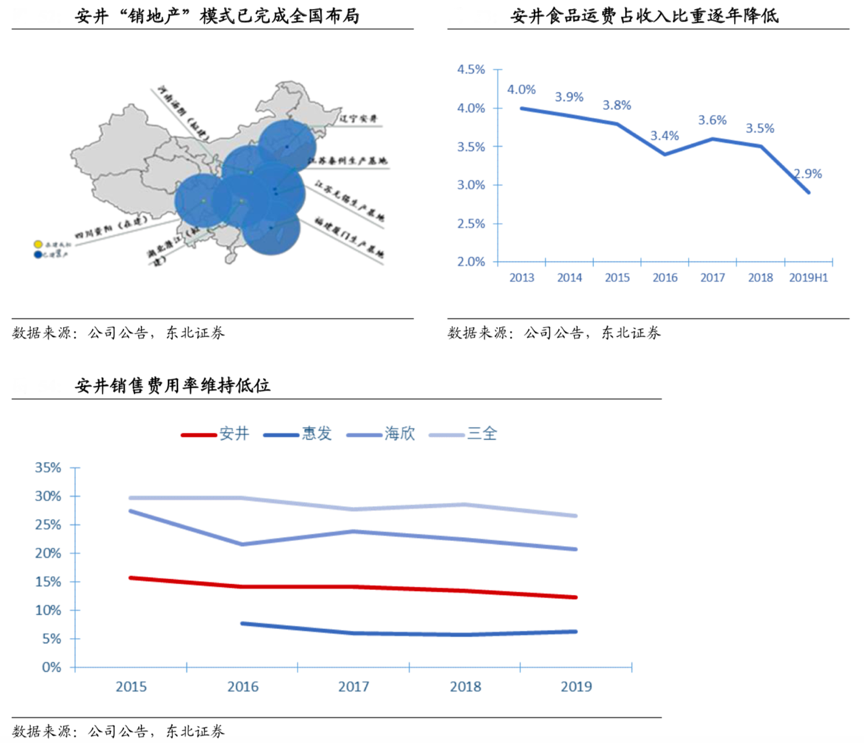 經典案例:根據公司公告、東北證券等綜合資訊表明,安井食品堅持“銷地產”模式,即在轄區銷售達到一定規模后就地布局建廠,以節約運費、提高市場反應速度、快速產生效益。近兩年該模式在華南西南地區效益明顯,產能穩步提升,銷售額攀升迅速。2020 年上半年,華南、西南地區銷售收入同比增長分 別為 29.71%、31.37%。