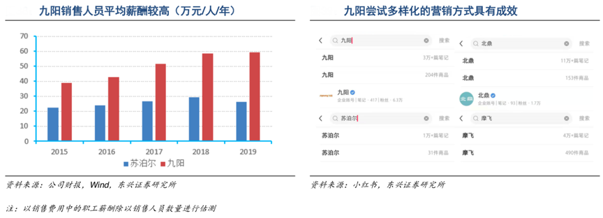 經典案例:根據公司財報、小紅書、wind、東興證券研究所等綜合資訊表明,九陽產品經理進行市場調研發現需求端的機會,研發人員據此開展設計,銷售人員再進行針對性推廣,三者之間形成緊密的合作。九陽2015 年起開始關注 KOL、KOL 等新媒體傳播方式,當前已經積累了 600 萬微信公眾號粉絲,約 2000 萬用戶粉絲,可以實現直接與用戶進行互動。