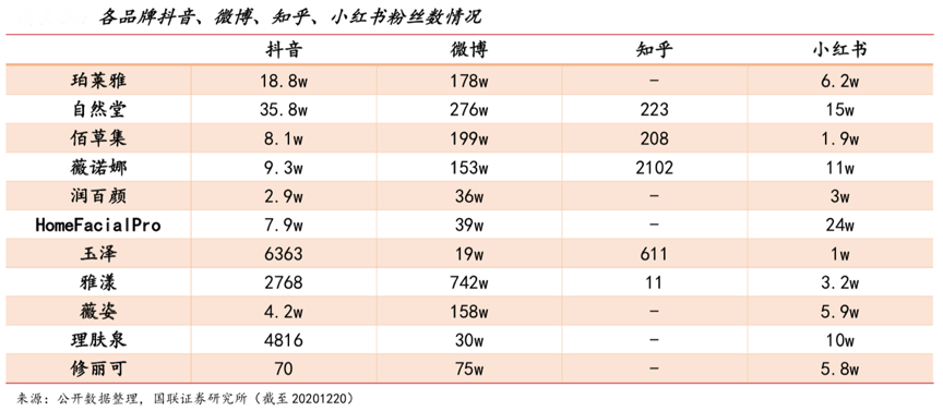 經典案例:根據市場公開數據、國聯證券研究所等綜合資訊表明,貝泰妮公司堅持品牌推廣戰略,旗下“薇諾娜”品牌在消費者群體中已經具備了較高的知名度。截至目前,其薇諾娜官方旗艦店(天貓)已積累了 600 多萬粉絲,其在抖音、微博、知乎、小紅書上營銷能力較為均衡,較國外敏感肌護膚品牌雅漾、薇姿、理膚泉、修麗可等在各大社交平臺的營銷能力更為綜合,對于新興平臺的營銷布局反映速度更快。