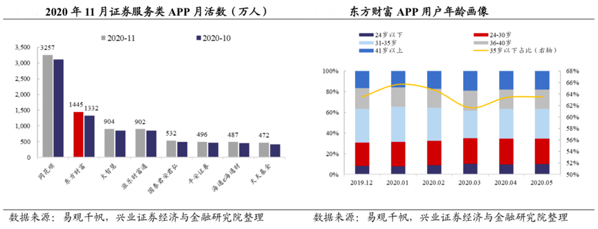 經(jīng)典案例:根據(jù)易觀千帆、興業(yè)證券經(jīng)濟(jì)與金融研究院等綜合資訊表明,東方財(cái)富 APP 人均單日訪問時(shí)長(zhǎng)由2017 年的約 30 分鐘顯著提升至當(dāng)前的近 70 分鐘,其不斷加強(qiáng)產(chǎn)品創(chuàng)新研發(fā),持續(xù)提升用戶體驗(yàn)和市場(chǎng)占有率。從用戶畫像來看,東財(cái) APP 聚焦中青年用戶,35 歲以下占比維持 65%左右。截至 2020 年 5 月,東 財(cái) APP 用戶 24 歲以下占比 9.9%,24-30 歲占比 24.8%,31-35 歲占比 28.8%,35 歲合計(jì)占比 63.5%。