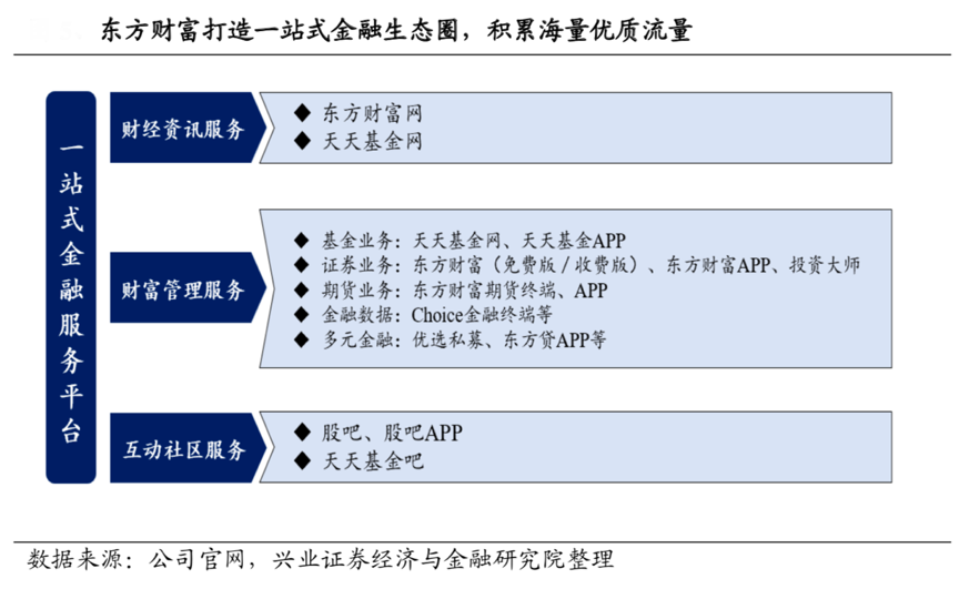 經(jīng)典案例:根據(jù)公司官網(wǎng)、興業(yè)證券經(jīng)濟(jì)與金融研究院等綜合資訊表明,東方財(cái)富公司深耕互聯(lián)網(wǎng)財(cái)經(jīng)資訊場(chǎng)景,打造出以“東方財(cái)富網(wǎng)”為核心,疊加“天天基金網(wǎng)+股吧”等多樣化場(chǎng)景賦能的一站式金融服務(wù)平臺(tái),形成了集“財(cái)經(jīng)資訊服務(wù)+財(cái)富管理服務(wù) +互動(dòng)社區(qū)服務(wù)”的金融生態(tài)圈,完成了海量財(cái)經(jīng)屬性流量的原始積累,并形成對(duì)金融投資人群的用戶粘性,為日后轉(zhuǎn)型發(fā)展奠定了堅(jiān)實(shí)的基礎(chǔ)。