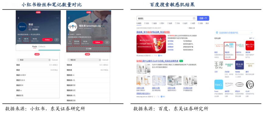 經典案例:根據小紅書、百度、東吳證券研究所等綜合資訊表明,在種草平臺小紅書上,薇姿官方賬號粉絲 5.8 萬,相關筆記 3 萬多篇,同比理膚泉粉絲達 10 萬,相關筆記大于 9 萬篇。在百度搜索敏感肌、噴霧、藥妝,相關推薦里理膚泉有50+條。