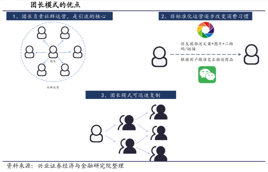經典案例:根據興業證券經濟與金融研究院等綜合資訊表明,社區團購能夠成功很大程度上是依靠團長的私域流量低成本獲客,團長作為引流的核心可以使自己的社交流量變現,并依靠在社區的信任度培養消費習慣和用戶粘性。“金牌團長”呼之欲出。