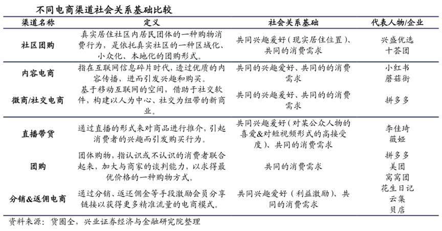 經典案例:根據貨圈全、興業證券經濟與金融研究院等綜合資訊表明,不同營銷方式基于的社會關系基礎不同,社區團購本質上依靠的是熟人營銷的優勢,相對于內容營銷與直播營銷來說,顧客天然具有更高的信任度,有利于促進消費行為的發生。