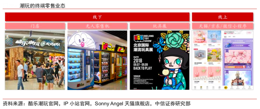 經典案例:根據酷樂潮玩官網、IP小站官網、Sonny Angel天貓旗艦店、中信證券研究部等綜合資訊表明,目前國內較為知名的潮玩品牌有 IP Station、19 八 3、酷樂潮玩、52Toys、ACtoys 等。其以全場景經營放大品牌體驗,線下以“門店和無人售貨機”通過密集地在核心商圈進行布局擴張,占據流量核心地段與用戶心智,通過組織參與潮流玩具展、授權展等展會進行推廣與銷售。線上:各潮玩運營商通在天貓、京東等電商平臺建立官方旗艦店,同步上新產品并且方便線下未觸達的用戶進行購買。此外,頭部玩家還通過微信小程序等進行會員轉化和推廣銷售。