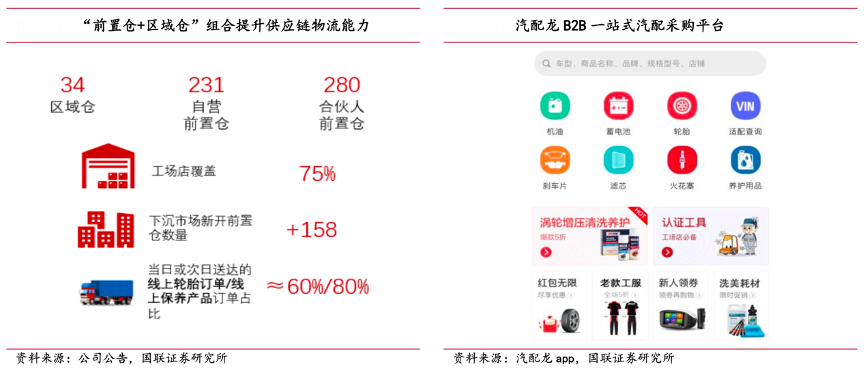 經典案例:根據公司公告、汽配龍app、國聯證券研究所等綜合資訊表明,途虎前置倉+區域倉組合滿足即時配送需求,目前全國 75%以上的工場店已被前置倉即時配送服 務覆蓋。前置倉還協同公司門店下沉發展戰略,將更多前置倉下沉至低線城市。“汽配龍”滿足長尾和低頻配件需求、線上系統賦能零配件交易,為途虎工廠店、合作門店及其他終端門店提供即時采購、撮合服務。截至 2023Q1,汽配龍對接了門店的產品需求、配送中心的采購需求及超 2,200 家外部零配件供應商的供應能力。