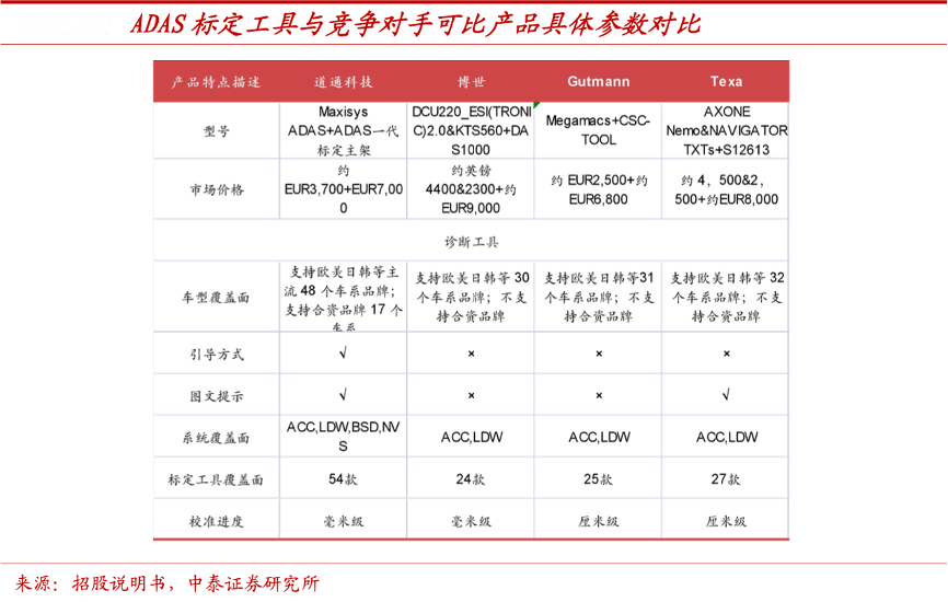 經典案例:根據招股說明書、中泰證券研究所等綜合資訊表明,道通科技公司 ADAS 產品較早進入市場,其與可比公司博世、Gutmann、Texa 等可比公司產品相比,車型、系統覆蓋面較廣,操作更便捷。以公司標定工具 ADAS 一代標定主架為例,產品支持歐美日韓等主流 48 個車系品牌,標定工具覆蓋面包含 54 款,系統覆蓋面顯著優于可比公司;引導方式和圖文提示更便捷,擁有較好的客戶體驗。