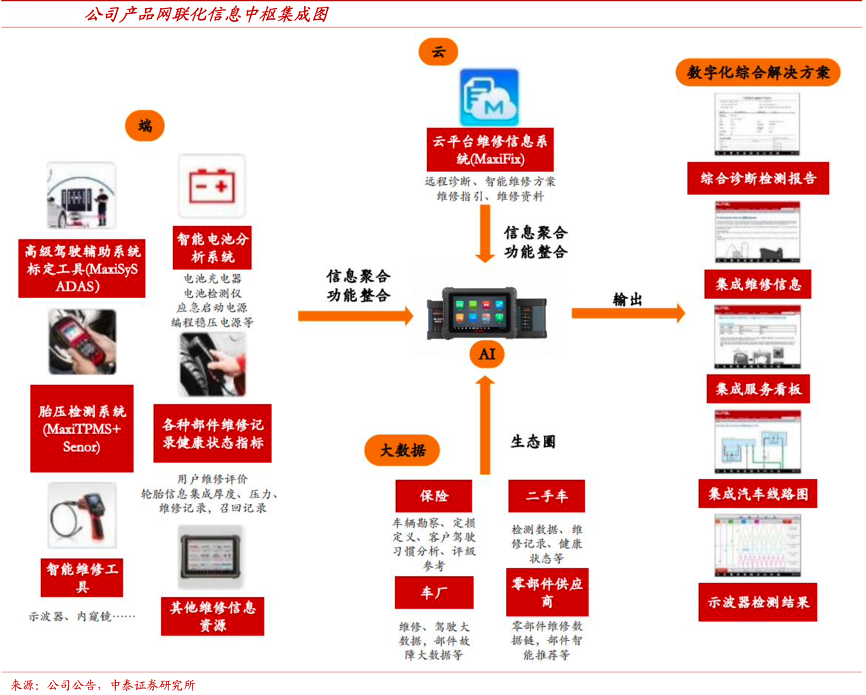 經典案例:根據公司公告、中泰證券研究所等綜合資訊表明,道通科技公司汽車智能診斷電腦通過與云平臺、大數據技術的結合,逐步集成和互通各種汽車電子零部件、內外部專用診斷檢測設備及其檢修數據,連接產品逐步新增的功能群,開放信息端口,并引入汽車廠、保險、二手車、零部件供應商等汽車后市場生態圈資源,形成信息聚合的中樞和功能整合平臺,輸出全方位的汽車健康狀況檢測報告及各種綜合解決方案及服務。