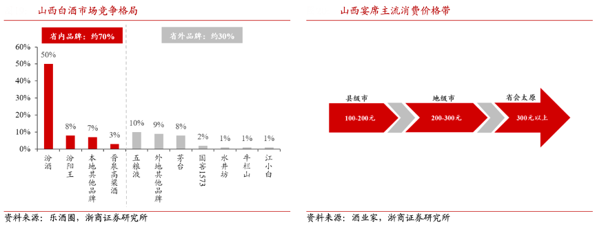 經典案例:根據樂酒圈、酒業家、浙商證券研究所等綜合資訊表明,山西白酒市場龍頭地位穩固,呈現“一超多強”的競爭格局。目前,在山西百億市場份 額中,本地白酒品牌共占 70%市場份額,山西縣級市場的宴席主流消費價格在 100-200 元左右,地級市主要在 200-300 元之間。