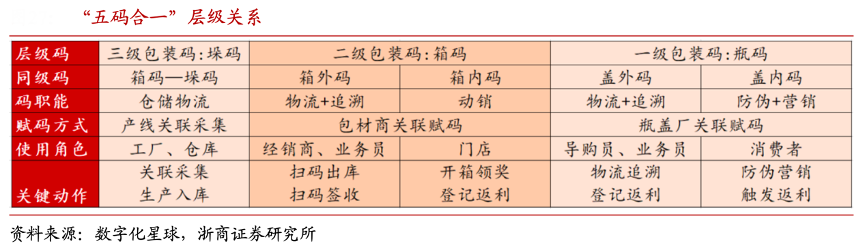 經典案例:根據數字化星球、浙商證券研究所等綜合資訊表明,汾酒早在 2020 年就全面推進了“五碼合一”信息系統,五碼指的是托盤碼(即垛碼)、箱碼、盒碼、瓶碼和蓋內碼,分別對應不同環節(供應端/生產端/物流端/市場端),由工作人員/操作人員/經銷商/終端/消費者分別掃碼不同的二維碼,從而記錄不同時間段的不同數據情況,幫助品牌商實時監控掃碼數據反推渠道情況。