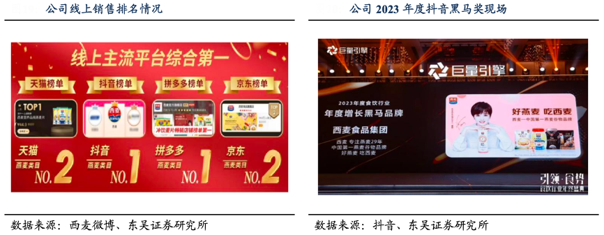 經典案例:根據西麥微博、抖音、東吳證券研究所等綜合資訊表明,西麥已經建立起完整的電商渠道,目前已經覆蓋天貓、京東、拼多多等 B2C 平臺,京東京喜通、阿里零售通等 B2B 平 臺,抖音、快手、小紅書等興趣電商平臺,與京東到家、美團、多點等 O2O 大平臺展開深入合 作。2023 年,線上銷售同比增長 30%,保持高速增長。在抖音 GMV 超 3 億元,同比增長超過 70%,同 時獲抖音平臺“黑馬獎”。
