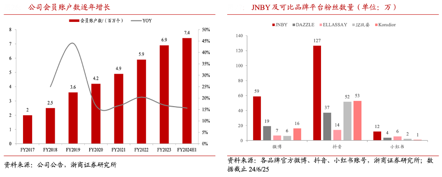 經典案例:根據公司公告、各品牌官方微博、抖音、小紅書帳號、浙商證券研究所等綜合資訊表明,江南布衣通過搭配等增值服務、售后服務以及會員福利增強會員粘性,截至 FY2024H1 公司會員賬戶數量達 740 萬 個,FY2017-2023 年復合增速達23%。截止 24/6/25,JNBY 品牌在新興社交平臺微博、抖 音、小紅書上粉絲數量達 59、127、12 萬人,顯著領跑其他高端女裝。