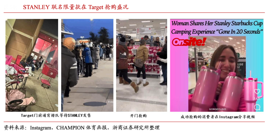 經典案例:根據Instagram、CHAMPION體育畫報、浙商證券研究所等綜合資訊表明,歷史上聯名款包括星巴克、侏羅紀公園電影聯名、歌手聯名等,聯名款助推 STANLEY 破圈,且通常定價較高,如 7 月最新聯名款 STANLEY X 歌手 Olivia Rodrigo 的40 盎司保溫杯定價 55 美元,相比普通款高了 10 美元。
