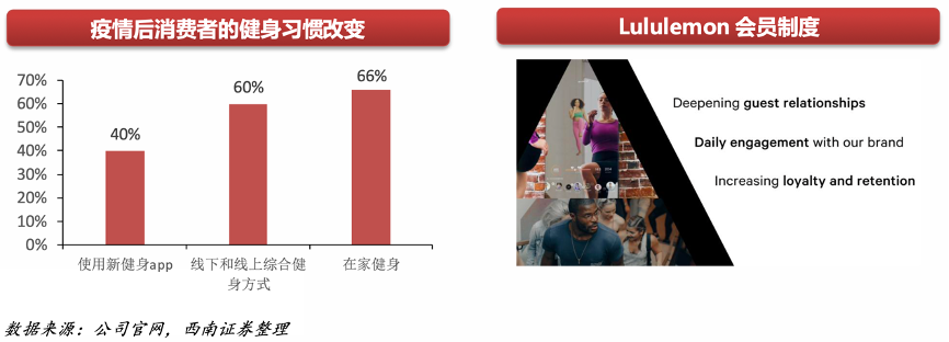 經典案例:根據公司官網、西南證券等綜合資訊表明,Lululemon公司通過Mirror、手機軟件(app) 和8家全球熱門健身公 司室合作,讓顧客開啟社群、健身、購物一體化體驗。根據大數據分析自2020年 以來,有40%的消費者在使用新的健身app,60%的消費者喜歡線下線上兩者綜合的健身方式,66%的消 費者表現更喜歡在家健身,其中使用線上健身app的消費者增長了300%。