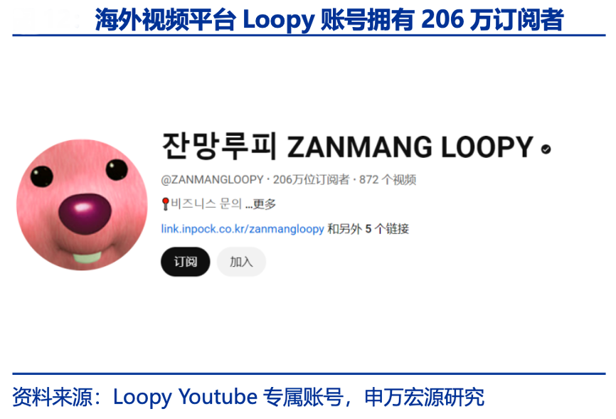 經典案例:根據Loopy Youtube專屬帳號、申萬宏源研究等綜合資訊表明, Loopy 原是 2001 年動畫《小企鵝 Pororo》角色,2022 年通過 ICONIX 在海外視頻平臺運營的專屬賬號, 以打工 vlog、直播和綜藝內容重塑為虛擬女明星,吸引了 206 萬訂閱者,成為現象級 IP。其社恐特質引起新入職年輕人共鳴,引發了二創表情包風潮,進一步鞏固其頂級 IP 地位。