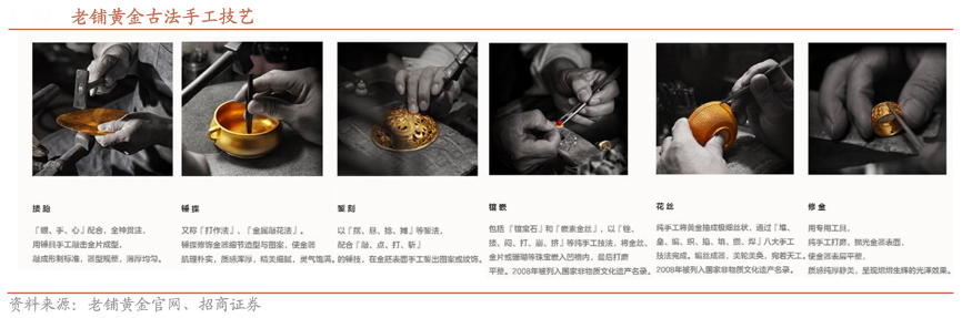 經(jīng)典案例:根據(jù)老鋪黃金官網(wǎng)、招商證券等綜合資訊表明,老鋪黃金定位“手工古法金器”,通過古法鑄型(失蠟 法、手工摟胎)、手工細(xì)金(錘揲、花絲、鏨刻、鑲嵌、鏤空、炸珠、燒藍(lán))、 手工修金等工藝手法,使得產(chǎn)品兼具現(xiàn)代審美與傳統(tǒng)文化,自然賦予品牌歷史厚重感。