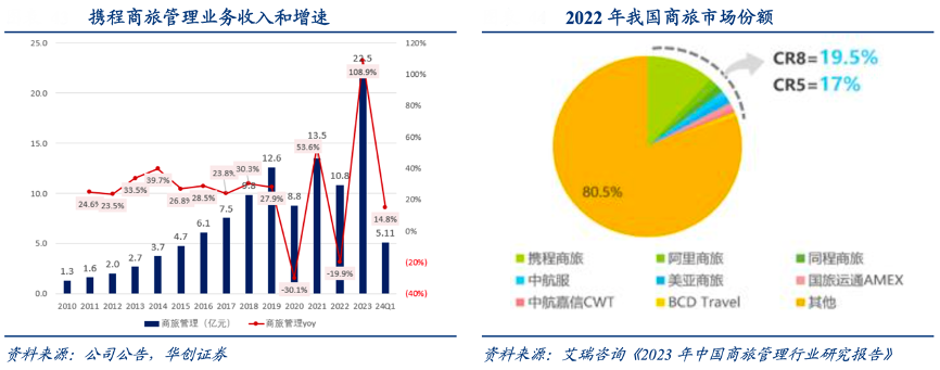 經典案例:根據公司公告、艾瑞咨詢《2023年中國商旅管理行業研究報告》、華創證券等綜合資訊表明,工作+休閑的“混合式旅行”發展下,2022 年攜程商旅板塊新增【度假旅游】入口,商旅用戶可以在預訂商務性質的可報銷的訂單下,單獨預訂個人旅游用途的私人訂單,進一步滿足商旅客群的休閑需求。2023 年商旅業務實現 23.5 億營收,同比增長 108.9%,較 19 年增長近 8 成。