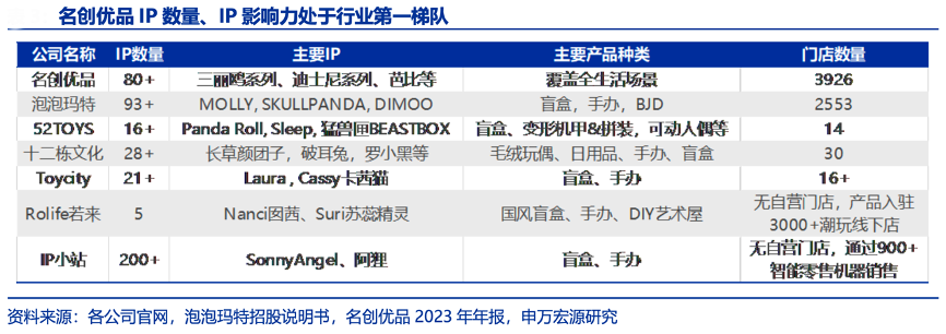 經典案例:根據各公司官網、泡泡瑪特招股說明書、名創優品2023年年報、申萬宏源研究等綜合資訊表明,與國內其他潮玩產業玩家相比,名創優品在 IP 數量及 IP 知名度方面具有較大優勢。據公司官網,截至目前,名創優品已與超 80 個國內外知名 IP 進行深度合作,同時名創優品線下門店規模優勢 顯著,截至 2023 年底國內線下門店數達 3926 家。
