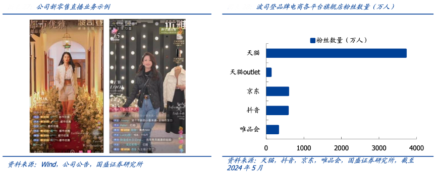 經典案例:根據wind、公司公告、天貓、抖音、京東、唯品會、國盛證券研究所等綜合資訊表明,目前波司登公司電商已經形成全面的平臺布局:天貓、京東、唯品會、抖音等多平臺全面覆蓋,傳統電商、直播電商多點開花。據各平臺數據,截至 2024 年 5 月主品牌 波司登在天貓/京東/抖音/唯品會平臺旗艦店鋪粉絲數量分別為 3714/588/577/318 萬人,過去持續增長。